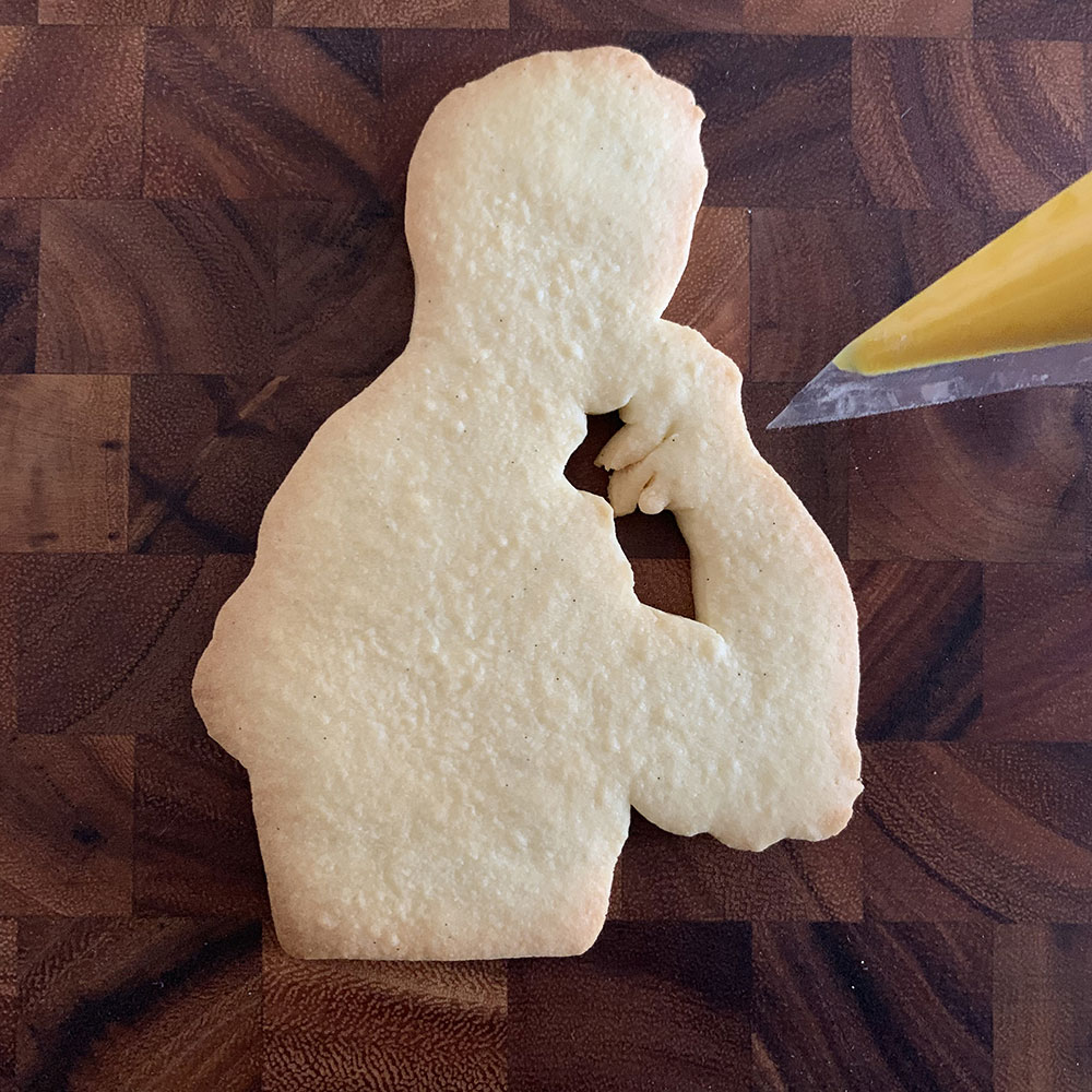 黒いアイシングを使い、髪や表情、そしてトラックスーツの黒いラインを描きます。