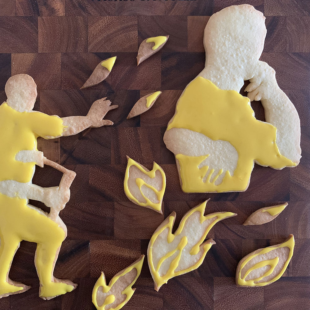 次はヌンチャクを持った全身像の方を仕上げましょう。こちらも黒いアイシングで髪や表情、トラックスーツの黒いラインを入れます。
