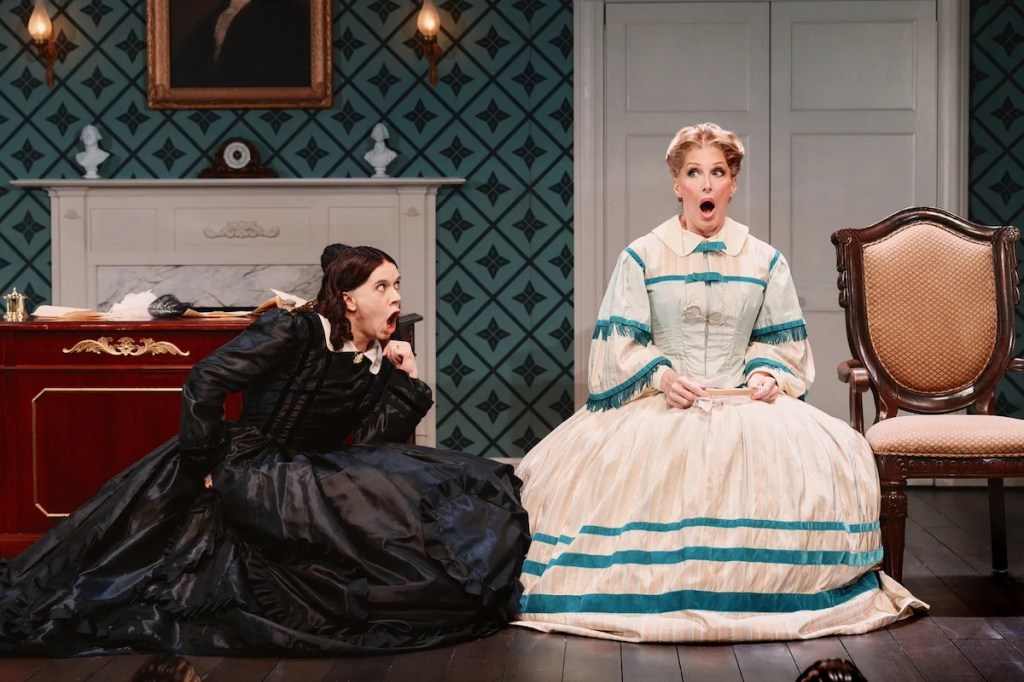 だがメアリーは、退屈で憂鬱な生活から抜け出して自分の夢を実現をするために文字通りドタバタもがき、こめかみの巻き毛をブンブン揺らしながらフープで膨らませたスカートをひっつかんで舞台上を駆け回る(ホリー・ピアソンの時代とコメディの両方をしっかりカバーした衣装が優れている)。その大げさでコミカルな動きと憂鬱でシリアスな表情のギャップ、シニカルでユーモアたっぷりのセリフ、時折客席に向かって送ってくる意味ありげな視線の全てに満場の観客は大喜びだ。